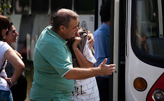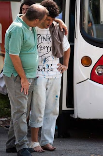 Segunda foto - O Moleque chorando aos prantos porque acha que vai ser pego pelo Bicho Papão (CT: ou pelo bicho do pé cabeludo, quem sabe...) na prisão. O pai tenta convencer o filho de que o bicho papão só existe na sua imaginação. O que existe de ruim, segundo disse o papaizinho, é a Polícia Opressora da mais-valia. Aí, antes do moleque entrar no ônibus, o pápi prometeu continuar a financiar a revolução de seu filhotinho, começando pelo pagamento da fiança na delegacia. Humm... Parecendo aquelas cenas do filme "E o Vento Levou". É de se emocionar!